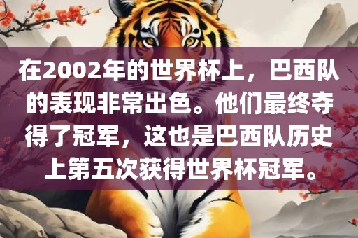 在2002年的世界杯上,巴西队的表现非常出色。他们最终夺得了冠军,这也是巴西队历史上第五次获得世界杯冠军。